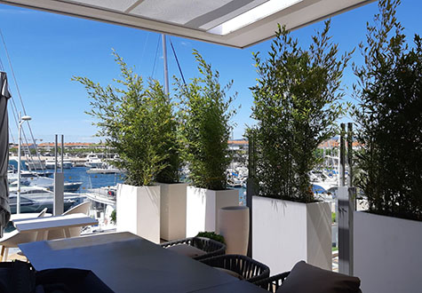 L'équipe du Casino Barrière de Saint-Raphaël (83) a fait appel aux services de l'agence Jardins de Gally - Sud Est pour aménager une terrasse élégante et naturelle. Nos jardiniers ont opté pour une végétalisation avec des Pittosporum taubira 'nana' et des Phyllostachys bisseti dans des pots fabriqués localement, par la manufacture Ravel, installée depuis 1837 à Aubagne.